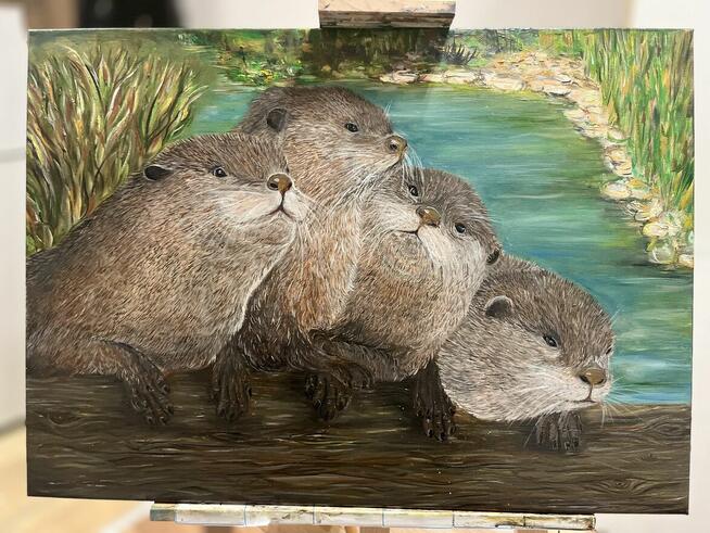 Obraz olejny „Wydry” – oryginał, 50 × 70 cm Oryginalny obraz olejny przedstawiający cztery wydry siedzące na pniu ...