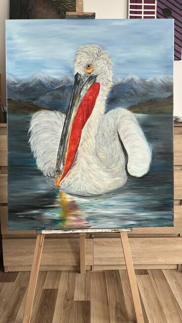 Sprzedam ręcznie malowany obraz olejny na płótnie przedstawiający kędzierzawego pelikana. Format: 100 × 80 cm. Obraz ...